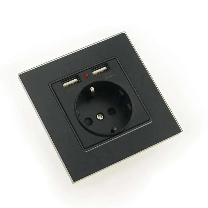 Best Product MiniTiger Black Luxury Glass Panel Wall Power Socket 16A EU Electrical Outlet With 2.1 A Dual USB S
